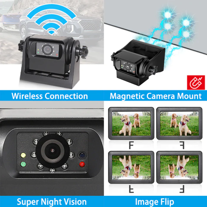 4. IR Night Vision & 100% Waterproof: The wireless reverse camera comes with 9 automatic Infra-Red LED lights which features great night vision and wide viewing angle. IP68 waterproof, can withstand all weather elements.